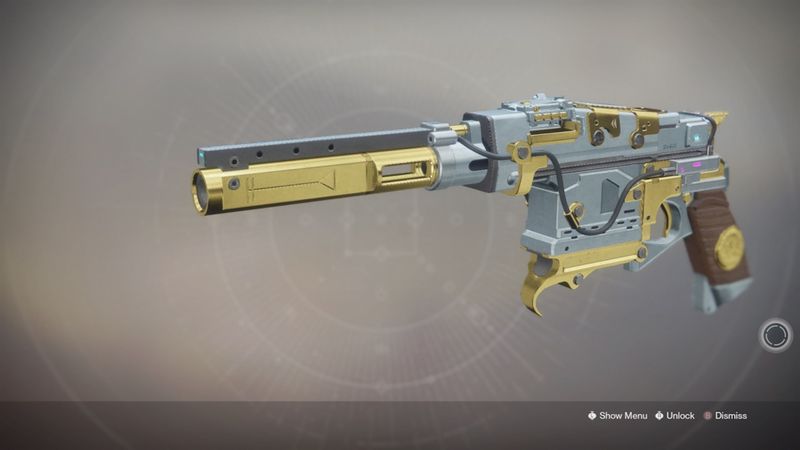 This image is a screenshot of a weapon from the Destiny series of first-person shooter video games developed by Bungie Studios and published by Bungie or Activision. It falls under the screenshot category for a copyrighted computer game or video game, and the copyright for it is most likely held by the company that developed the game. It is believed that the use of a limited number of web-resolution screenshots: