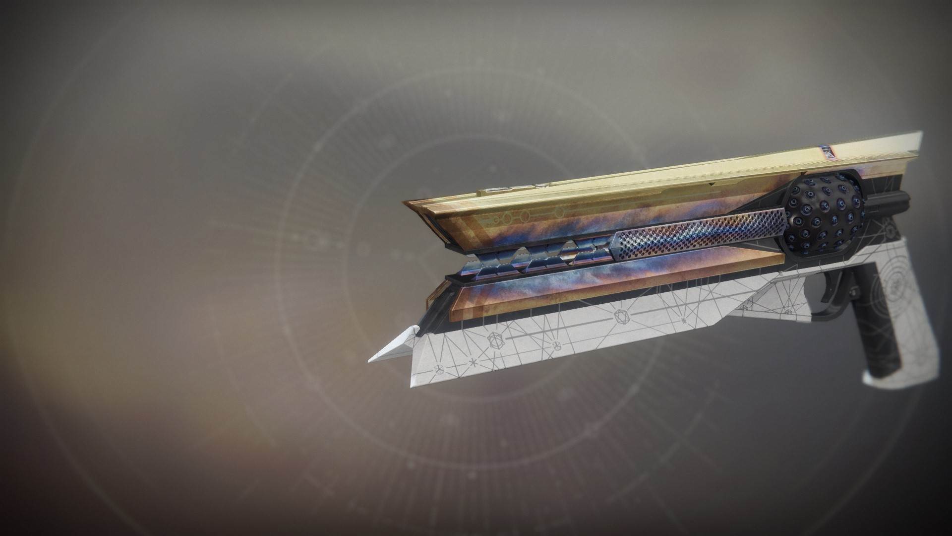 This image is a screenshot of a weapon from the Destiny series of first-person shooter video games developed by Bungie Studios and published by Bungie or Activision. It falls under the screenshot category for a copyrighted computer game or video game, and the copyright for it is most likely held by the company that developed the game. It is believed that the use of a limited number of web-resolution screenshots: