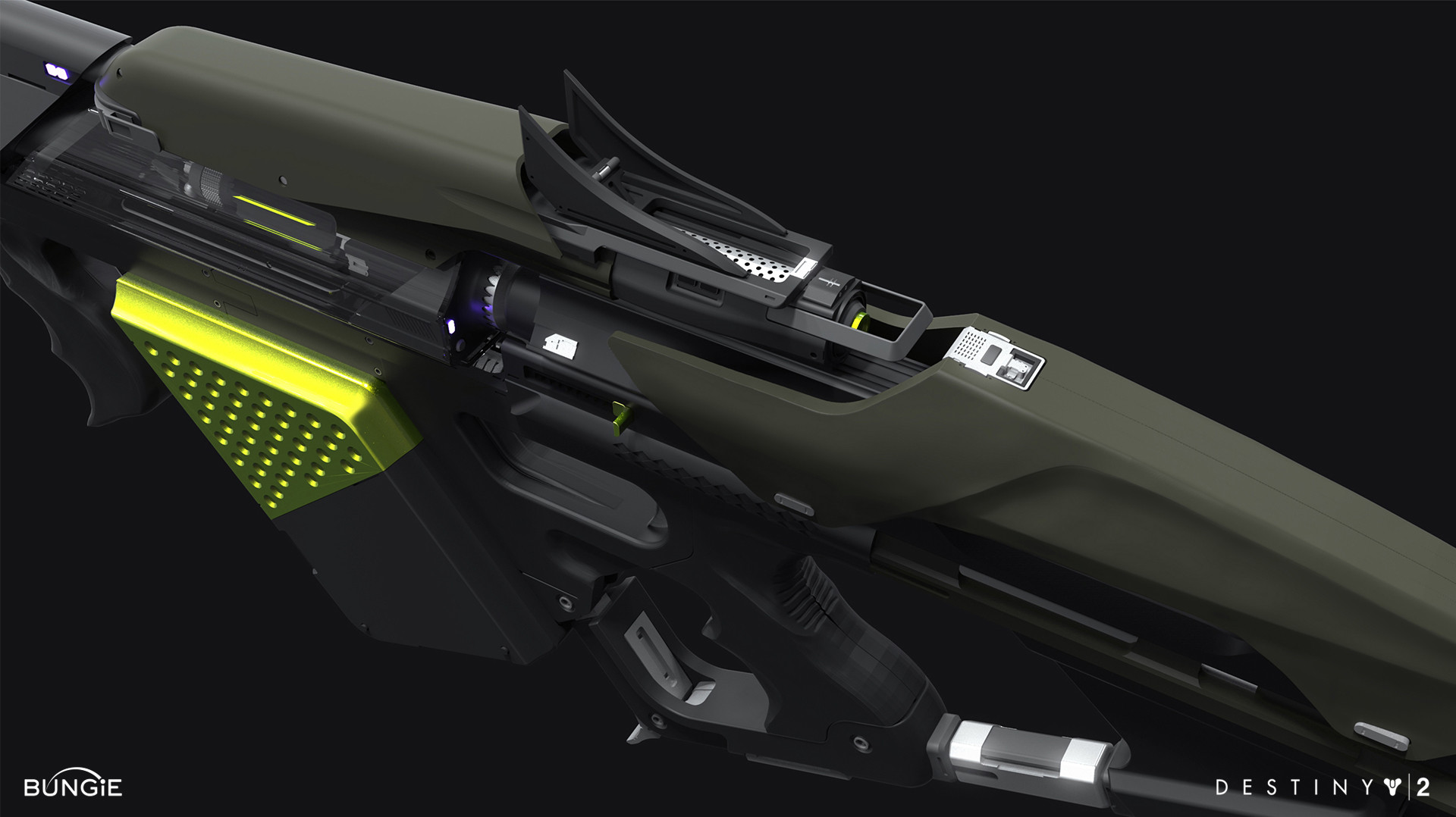 This image is a screenshot of a weapon from the Destiny series of first-person shooter video games developed by Bungie Studios and published by Bungie or Activision. It falls under the screenshot category for a copyrighted computer game or video game, and the copyright for it is most likely held by the company that developed the game. It is believed that the use of a limited number of web-resolution screenshots:
