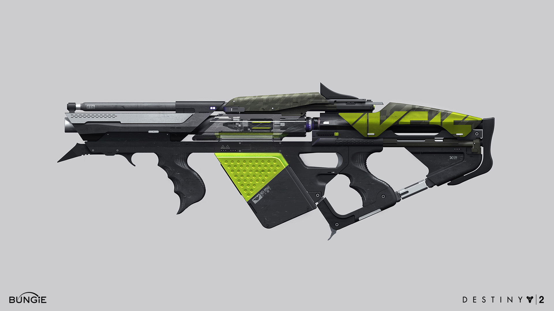 This image is a screenshot of a weapon from the Destiny series of first-person shooter video games developed by Bungie Studios and published by Bungie or Activision. It falls under the screenshot category for a copyrighted computer game or video game, and the copyright for it is most likely held by the company that developed the game. It is believed that the use of a limited number of web-resolution screenshots: