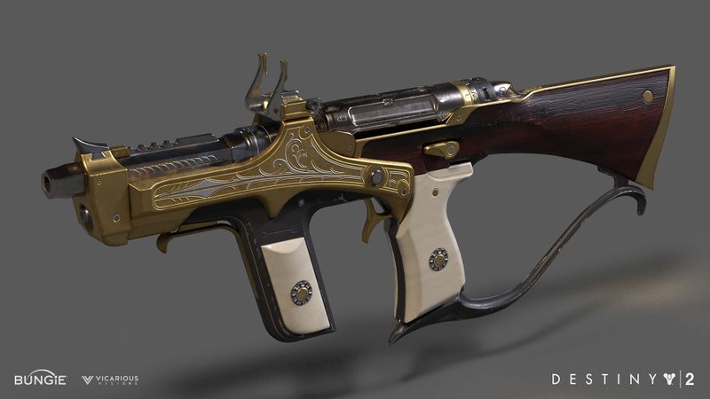 This image is a screenshot of a weapon from the Destiny series of first-person shooter video games developed by Bungie Studios and published by Bungie or Activision. It falls under the screenshot category for a copyrighted computer game or video game, and the copyright for it is most likely held by the company that developed the game. It is believed that the use of a limited number of web-resolution screenshots: