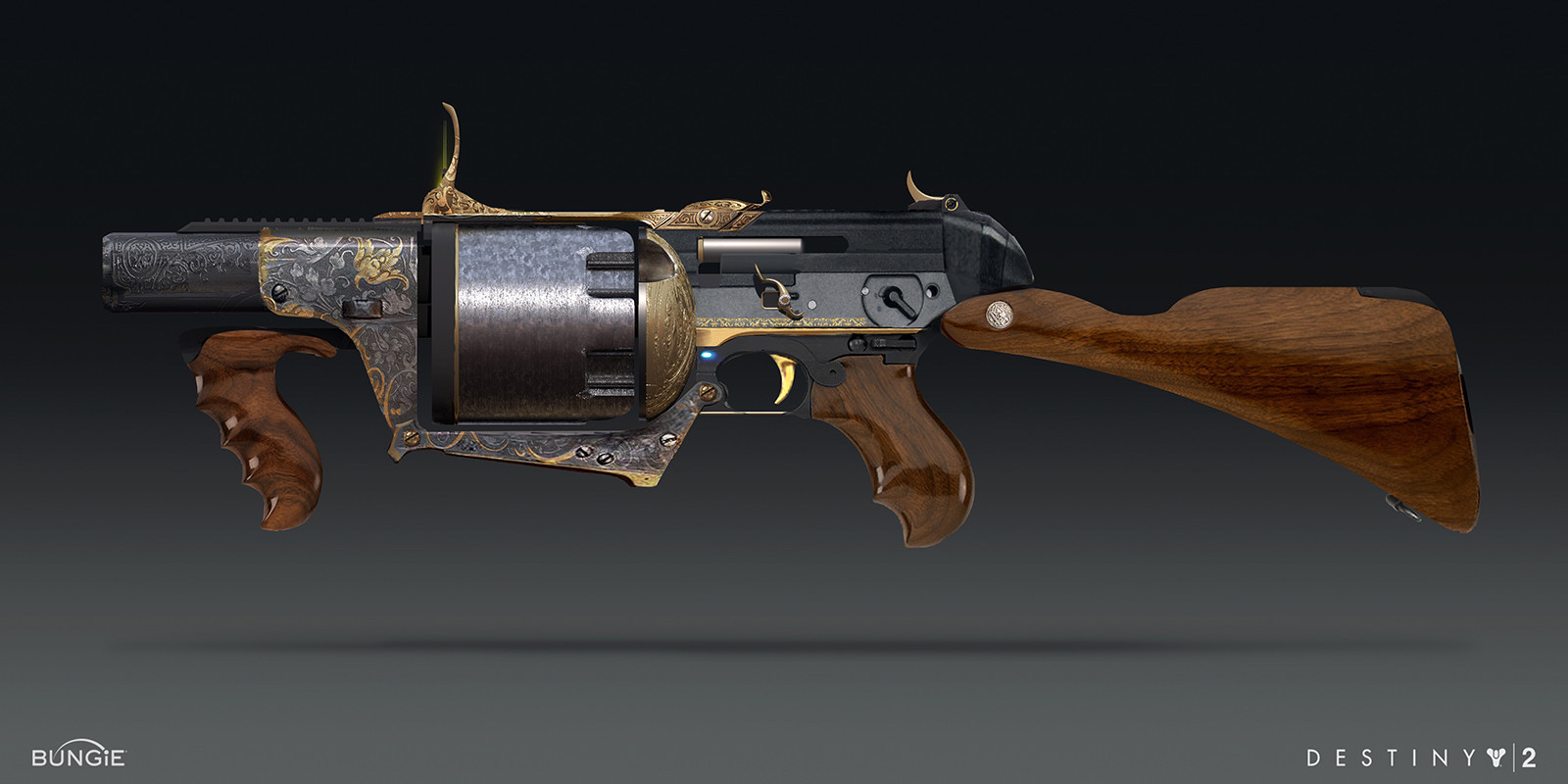 This image is a screenshot of a weapon from the Destiny series of first-person shooter video games developed by Bungie Studios and published by Bungie or Activision. It falls under the screenshot category for a copyrighted computer game or video game, and the copyright for it is most likely held by the company that developed the game. It is believed that the use of a limited number of web-resolution screenshots: