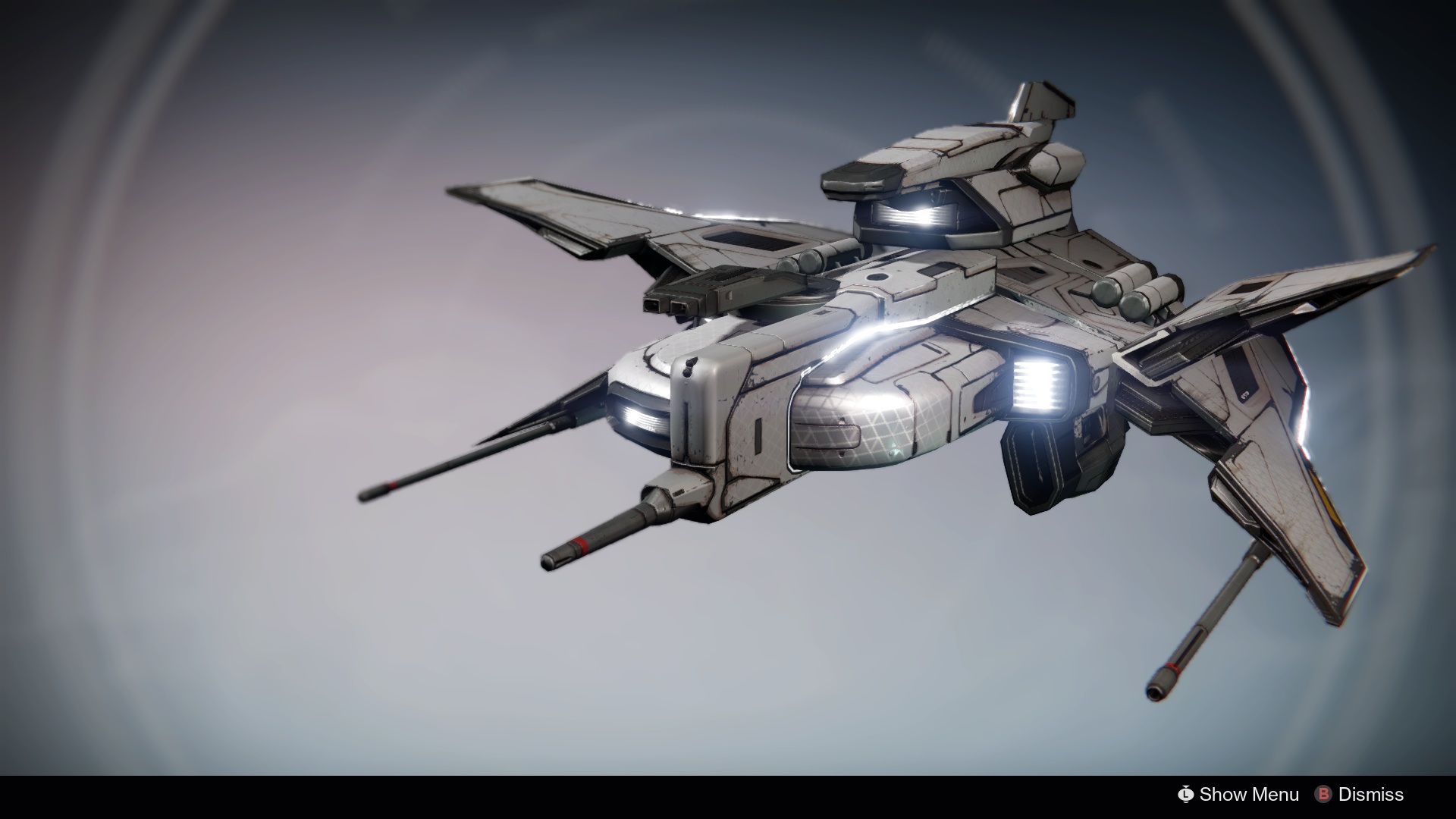 This image is a screenshot of a vehicle from the Destiny series of first-person shooter video games developed by Bungie Studios and published by Bungie or Activision. It falls under the screenshot category for a copyrighted computer game or video game, and the copyright for it is most likely held by the company that developed the game. It is believed that the use of a limited number of web-resolution screenshots: