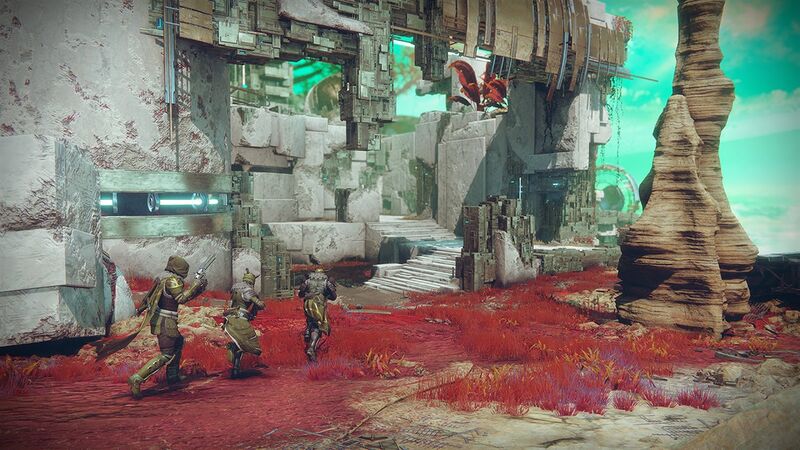 Three Guardians approach the nearby Transfer Gate in the Destiny 2 Crucible map Distant Shore, which unlocks alongside Iron Banner on October 10, 2017.