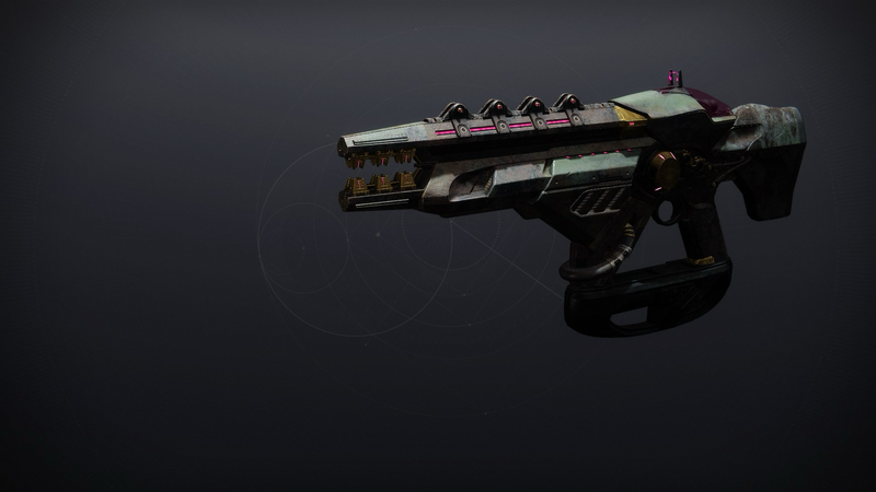This image is a screenshot of a weapon from the Destiny series of first-person shooter video games developed by Bungie Studios and published by Bungie or Activision. It falls under the screenshot category for a copyrighted computer game or video game, and the copyright for it is most likely held by the company that developed the game. It is believed that the use of a limited number of web-resolution screenshots: