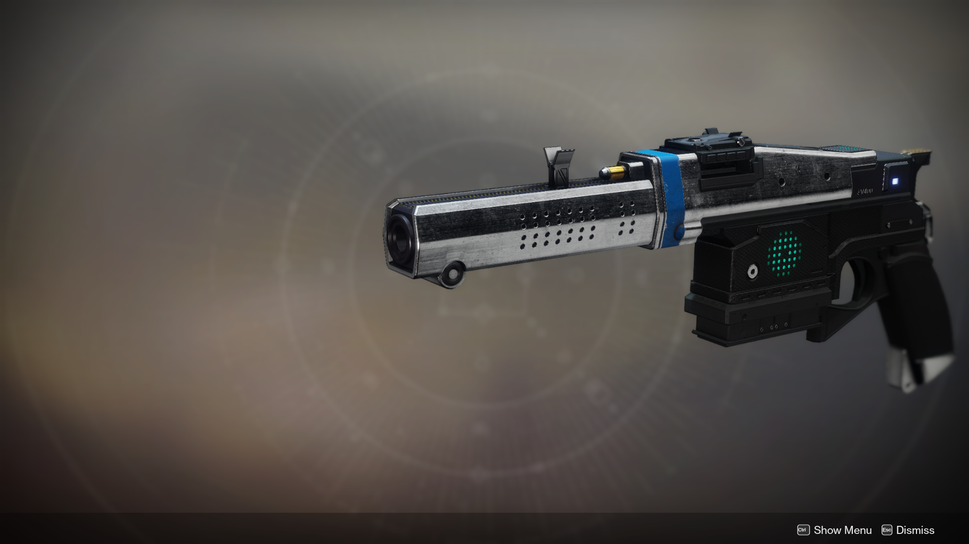 This image is a screenshot of a weapon from the Destiny series of first-person shooter video games developed by Bungie Studios and published by Bungie or Activision. It falls under the screenshot category for a copyrighted computer game or video game, and the copyright for it is most likely held by the company that developed the game. It is believed that the use of a limited number of web-resolution screenshots: