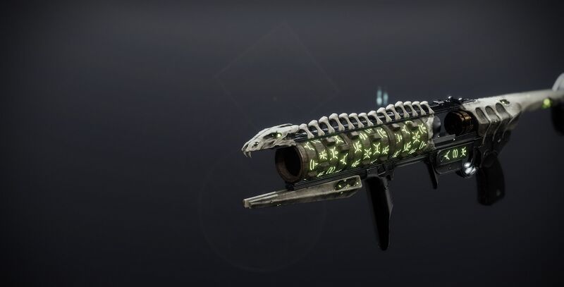 This image is a screenshot of a weapon from the Destiny series of first-person shooter video games developed by Bungie Studios and published by Bungie or Activision. It falls under the screenshot category for a copyrighted computer game or video game, and the copyright for it is most likely held by the company that developed the game. It is believed that the use of a limited number of web-resolution screenshots:
