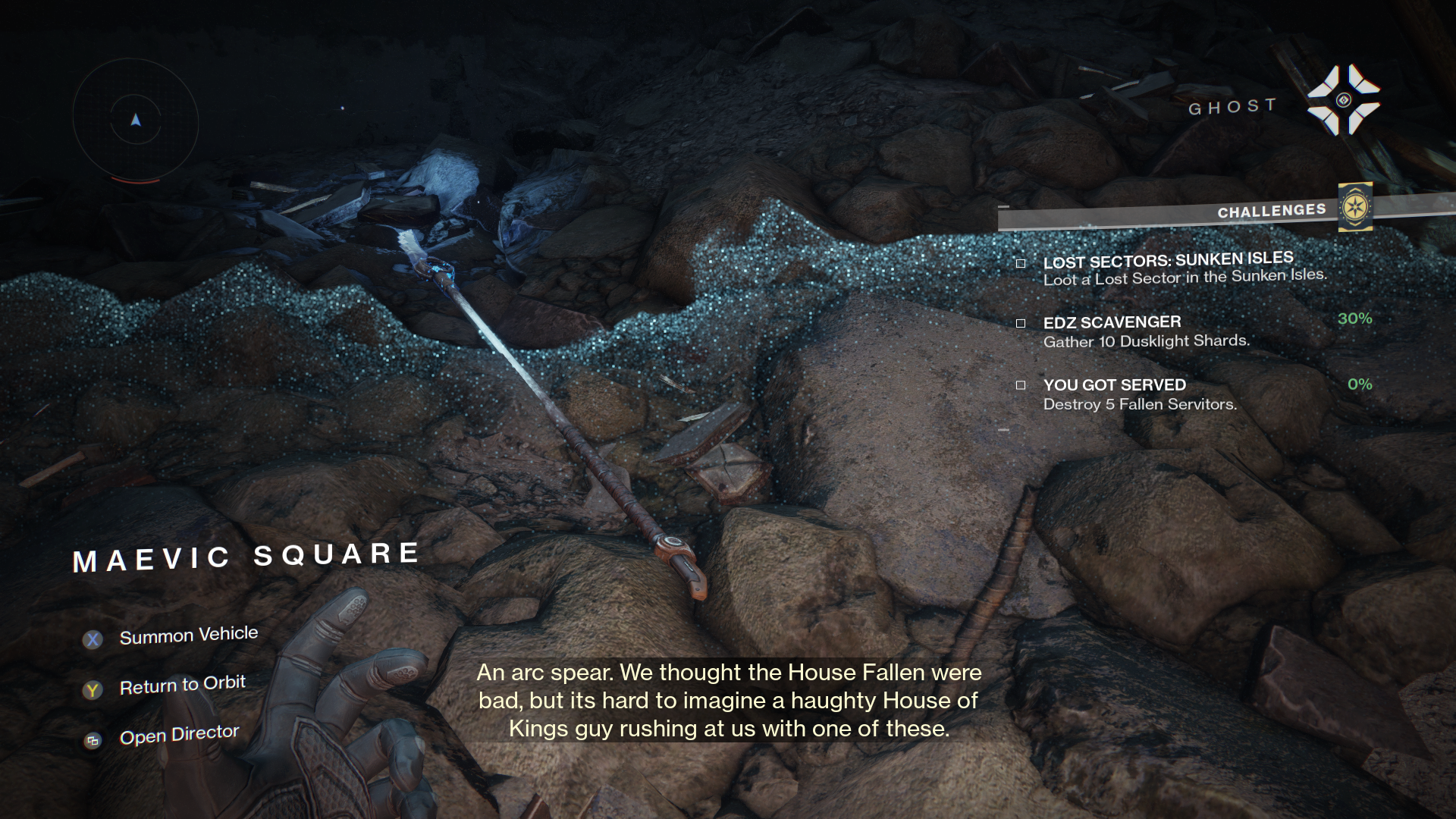 Ghost: "An arc spear. We thought the House Fallen were bad, but it's hard to imagine a haughty House of Kings guy rushing at us with one of these."
