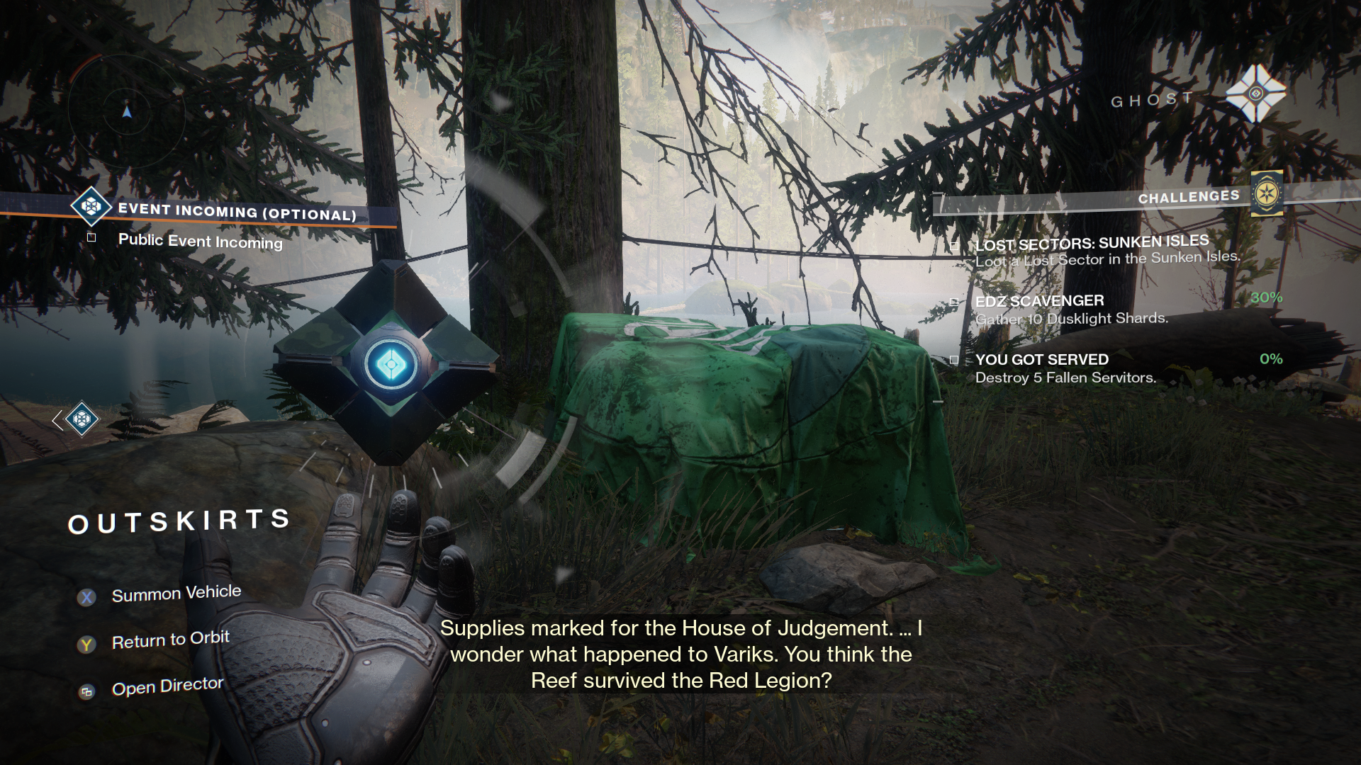 Ghost: "Supplies marked for the House of Judgment...I wonder what happened to Variks. You think the Reef survived the Red Legion?"