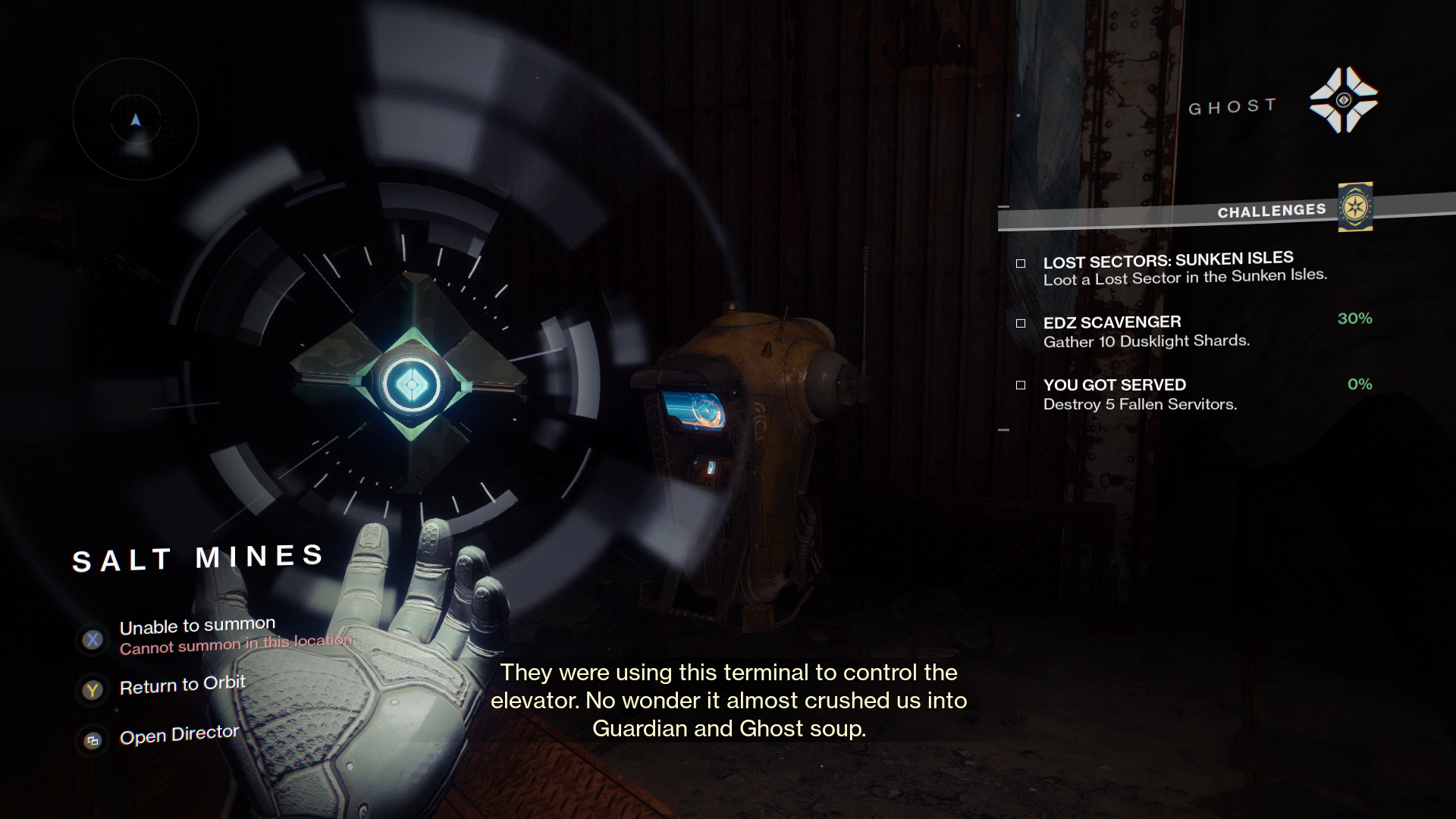 Ghost: "They were using this terminal to control the elevator. No wonder it almost crushed us into Guardian and Ghost soup."