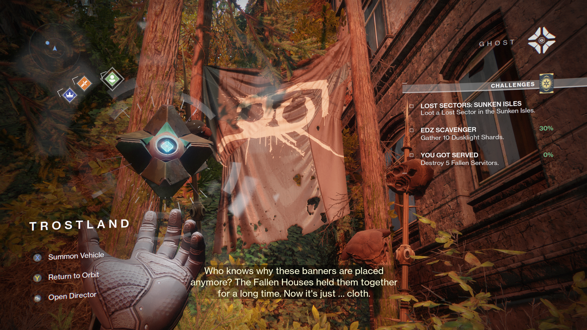 Ghost: "Who knows why these banners are placed anymore? The Fallen Houses held them together for a long time. Now it's just... cloth."