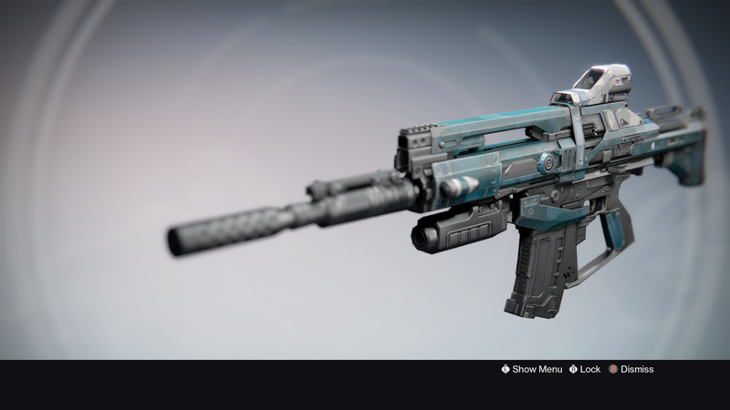This image is a screenshot of a weapon from the Destiny series of first-person shooter video games developed by Bungie Studios and published by Bungie or Activision. It falls under the screenshot category for a copyrighted computer game or video game, and the copyright for it is most likely held by the company that developed the game. It is believed that the use of a limited number of web-resolution screenshots:
