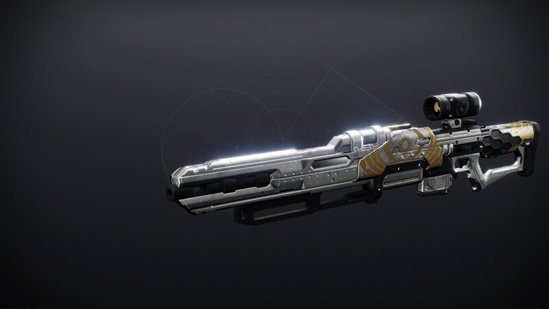 This image is a screenshot of a weapon from the Destiny series of first-person shooter video games developed by Bungie Studios and published by Bungie or Activision. It falls under the screenshot category for a copyrighted computer game or video game, and the copyright for it is most likely held by the company that developed the game. It is believed that the use of a limited number of web-resolution screenshots: