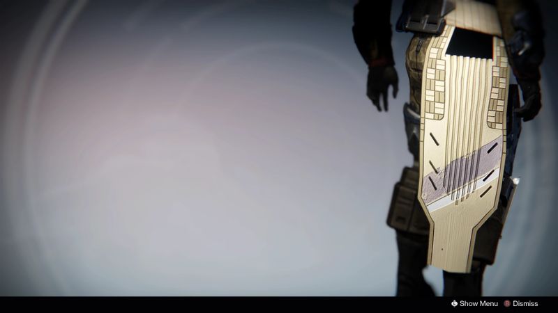 This image is a screenshot of a weapon from the Destiny series of first-person shooter video games developed by Bungie Studios and published by Bungie or Activision. It falls under the screenshot category for a copyrighted computer game or video game, and the copyright for it is most likely held by the company that developed the game. It is believed that the use of a limited number of web-resolution screenshots: