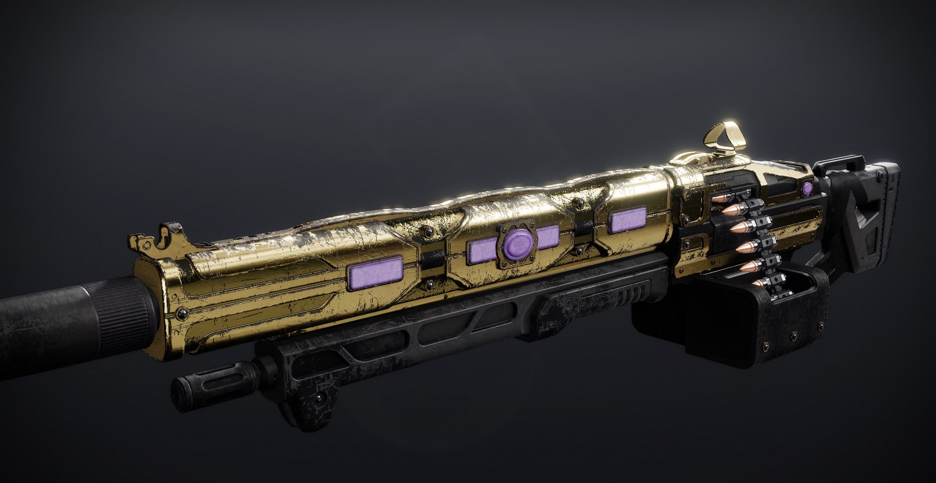 This image is a screenshot of a weapon from the Destiny series of first-person shooter video games developed by Bungie Studios and published by Bungie or Activision. It falls under the screenshot category for a copyrighted computer game or video game, and the copyright for it is most likely held by the company that developed the game. It is believed that the use of a limited number of web-resolution screenshots: