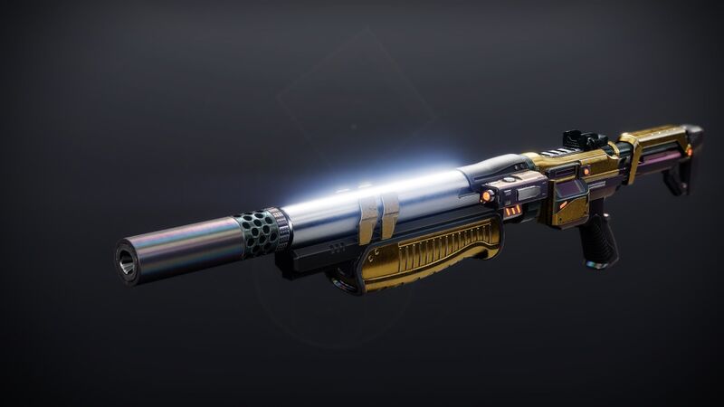 This image is a screenshot of a weapon from the Destiny series of first-person shooter video games developed by Bungie Studios and published by Bungie or Activision. It falls under the screenshot category for a copyrighted computer game or video game, and the copyright for it is most likely held by the company that developed the game. It is believed that the use of a limited number of web-resolution screenshots: