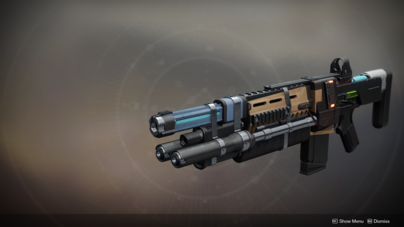 This image is a screenshot of a weapon from the Destiny series of first-person shooter video games developed by Bungie Studios and published by Bungie or Activision. It falls under the screenshot category for a copyrighted computer game or video game, and the copyright for it is most likely held by the company that developed the game. It is believed that the use of a limited number of web-resolution screenshots: