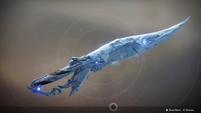 This image is a screenshot of a weapon from the Destiny series of first-person shooter video games developed by Bungie Studios and published by Bungie or Activision. It falls under the screenshot category for a copyrighted computer game or video game, and the copyright for it is most likely held by the company that developed the game. It is believed that the use of a limited number of web-resolution screenshots: