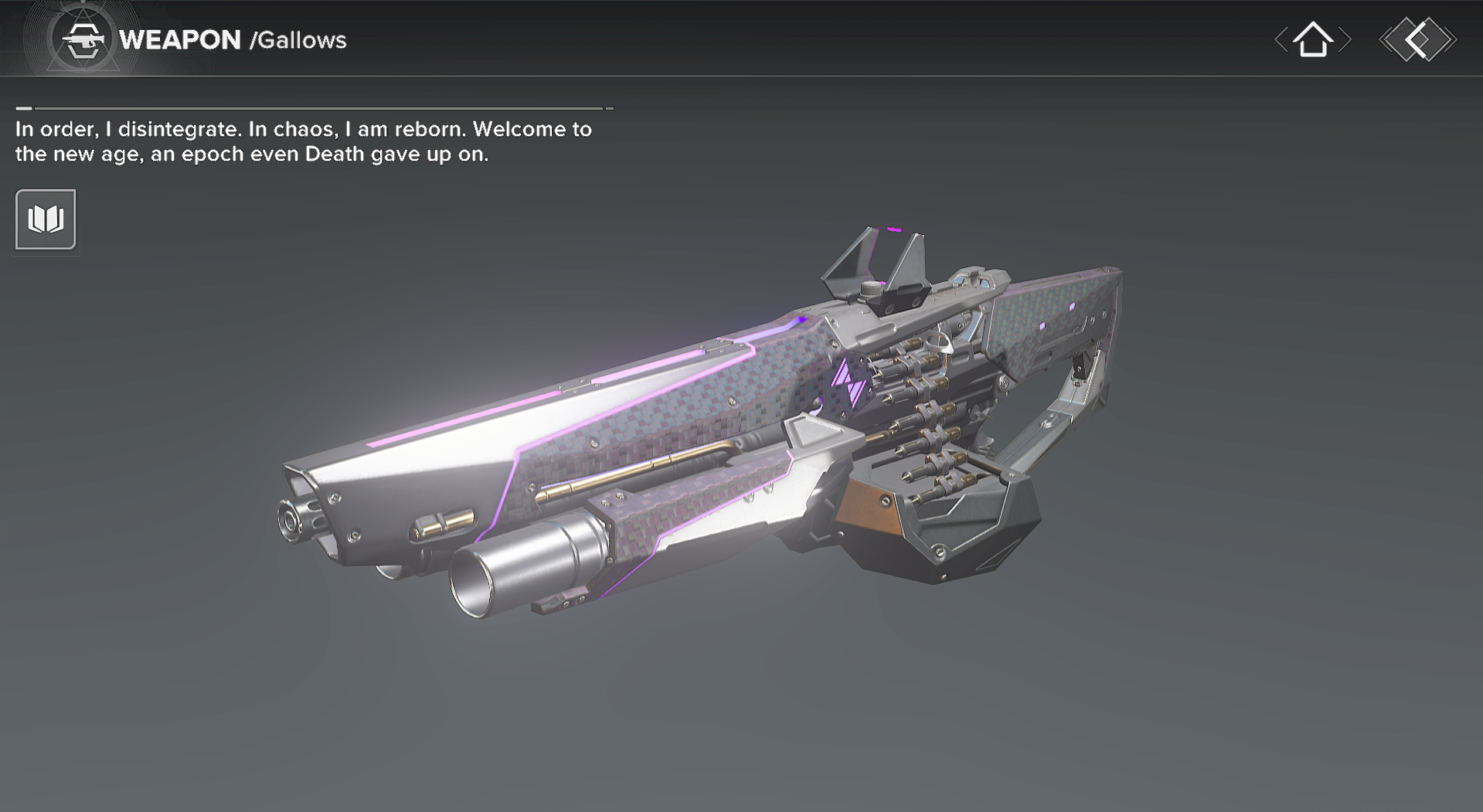 This image is a screenshot of a weapon from the Destiny series of first-person shooter video games developed by Bungie Studios and published by Bungie or Activision. It falls under the screenshot category for a copyrighted computer game or video game, and the copyright for it is most likely held by the company that developed the game. It is believed that the use of a limited number of web-resolution screenshots: