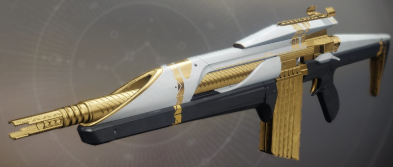 This image is a screenshot of a weapon from the Destiny series of first-person shooter video games developed by Bungie Studios and published by Bungie or Activision. It falls under the screenshot category for a copyrighted computer game or video game, and the copyright for it is most likely held by the company that developed the game. It is believed that the use of a limited number of web-resolution screenshots: