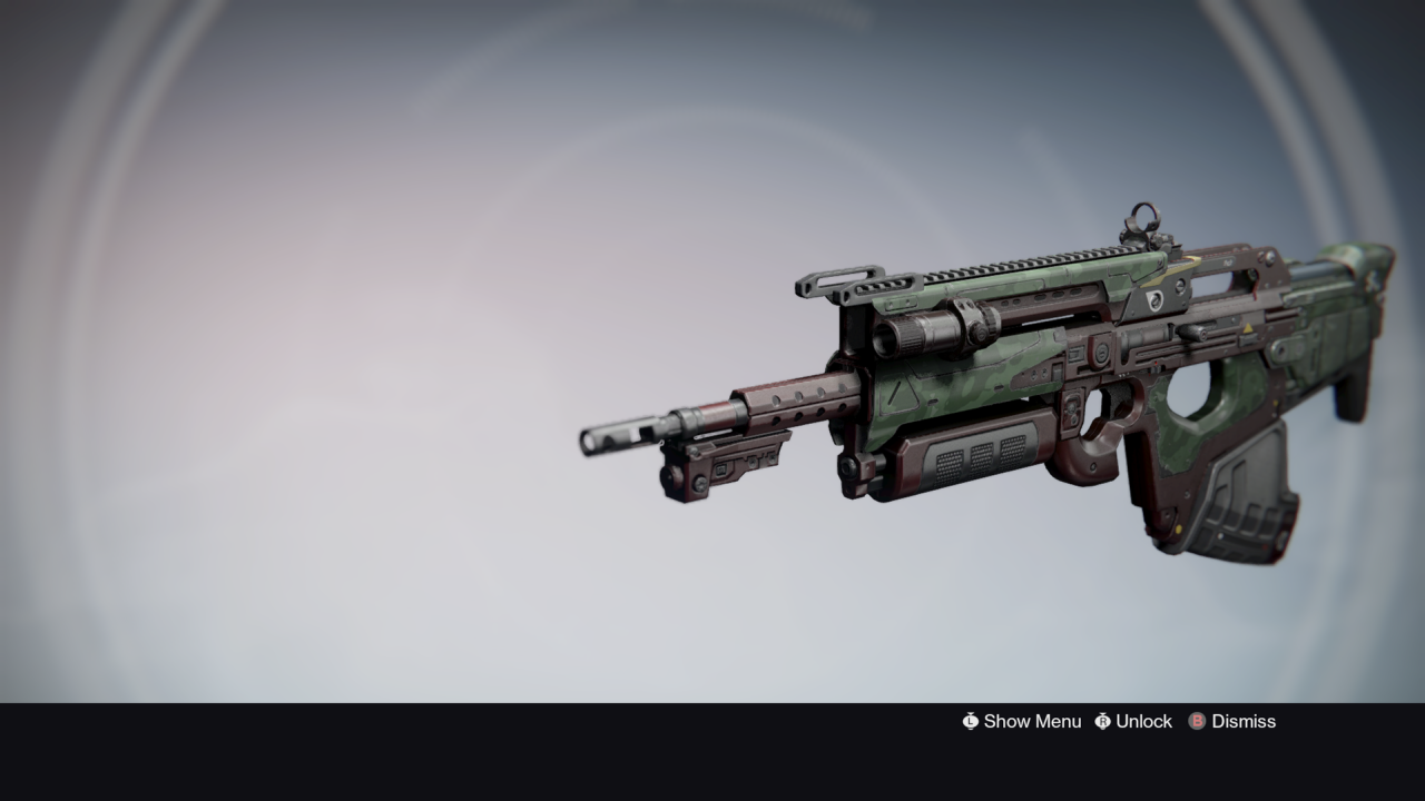 This image is a screenshot of a weapon from the Destiny series of first-person shooter video games developed by Bungie Studios and published by Bungie or Activision. It falls under the screenshot category for a copyrighted computer game or video game, and the copyright for it is most likely held by the company that developed the game. It is believed that the use of a limited number of web-resolution screenshots: