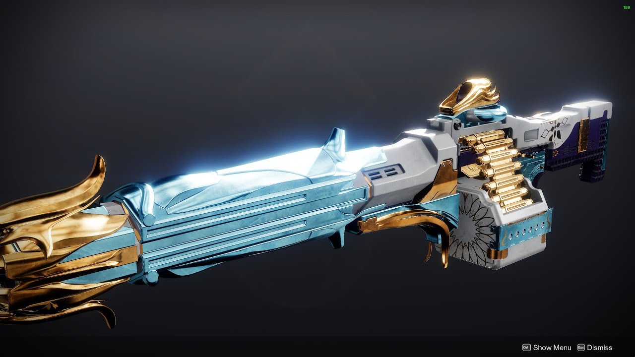 This image is a screenshot of a weapon from the Destiny series of first-person shooter video games developed by Bungie Studios and published by Bungie or Activision. It falls under the screenshot category for a copyrighted computer game or video game, and the copyright for it is most likely held by the company that developed the game. It is believed that the use of a limited number of web-resolution screenshots: