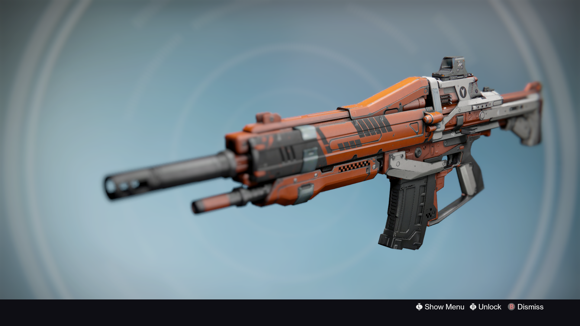 This image is a screenshot of a weapon from the Destiny series of first-person shooter video games developed by Bungie Studios and published by Bungie or Activision. It falls under the screenshot category for a copyrighted computer game or video game, and the copyright for it is most likely held by the company that developed the game. It is believed that the use of a limited number of web-resolution screenshots: