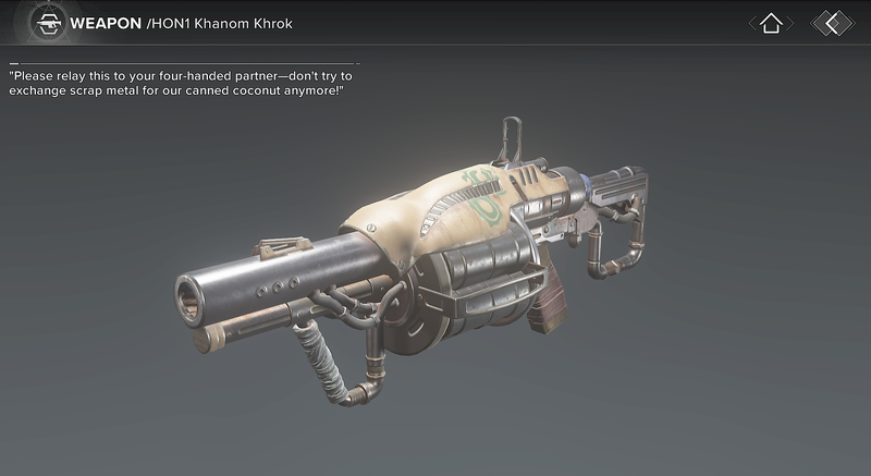 This image is a screenshot of a weapon from the Destiny series of first-person shooter video games developed by Bungie Studios and published by Bungie or Activision. It falls under the screenshot category for a copyrighted computer game or video game, and the copyright for it is most likely held by the company that developed the game. It is believed that the use of a limited number of web-resolution screenshots: