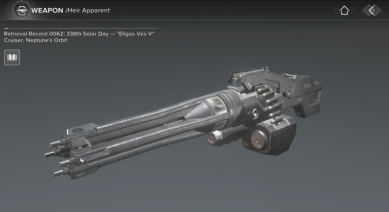 This image is a screenshot of a weapon from the Destiny series of first-person shooter video games developed by Bungie Studios and published by Bungie or Activision. It falls under the screenshot category for a copyrighted computer game or video game, and the copyright for it is most likely held by the company that developed the game. It is believed that the use of a limited number of web-resolution screenshots: