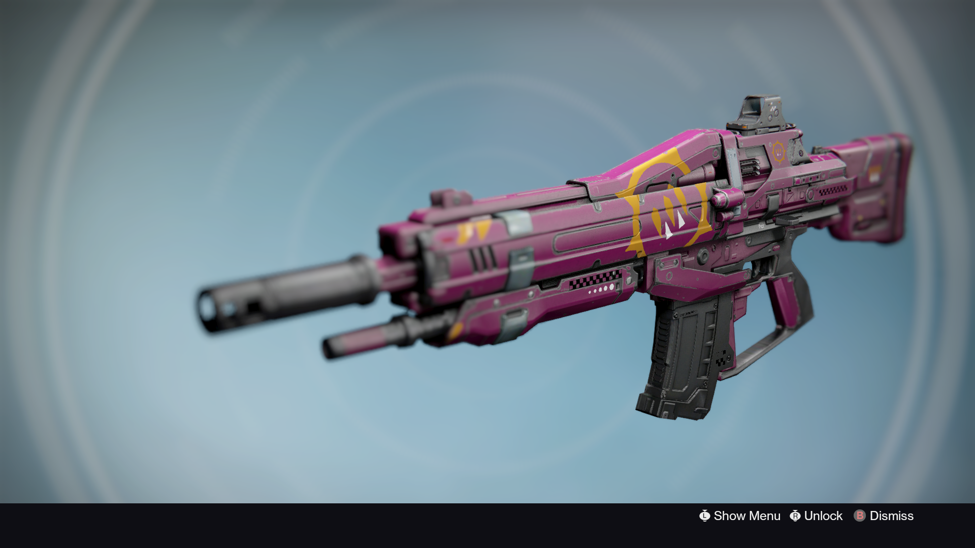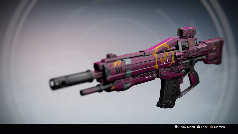 This image is a screenshot of a weapon from the Destiny series of first-person shooter video games developed by Bungie Studios and published by Bungie or Activision. It falls under the screenshot category for a copyrighted computer game or video game, and the copyright for it is most likely held by the company that developed the game. It is believed that the use of a limited number of web-resolution screenshots:
