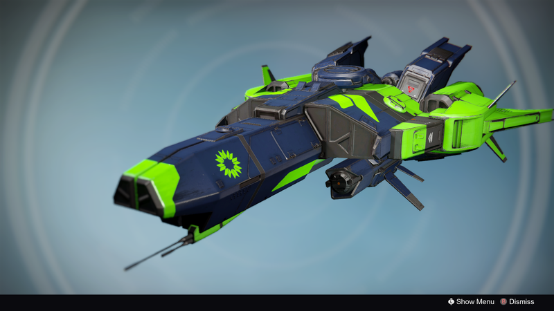 This image is a screenshot of a vehicle from the Destiny series of first-person shooter video games developed by Bungie Studios and published by Bungie or Activision. It falls under the screenshot category for a copyrighted computer game or video game, and the copyright for it is most likely held by the company that developed the game. It is believed that the use of a limited number of web-resolution screenshots: