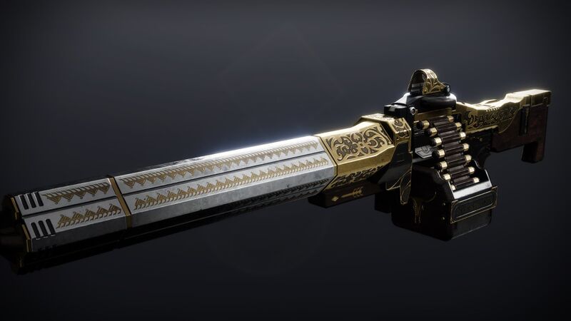 This image is a screenshot of a weapon from the Destiny series of first-person shooter video games developed by Bungie Studios and published by Bungie or Activision. It falls under the screenshot category for a copyrighted computer game or video game, and the copyright for it is most likely held by the company that developed the game. It is believed that the use of a limited number of web-resolution screenshots: