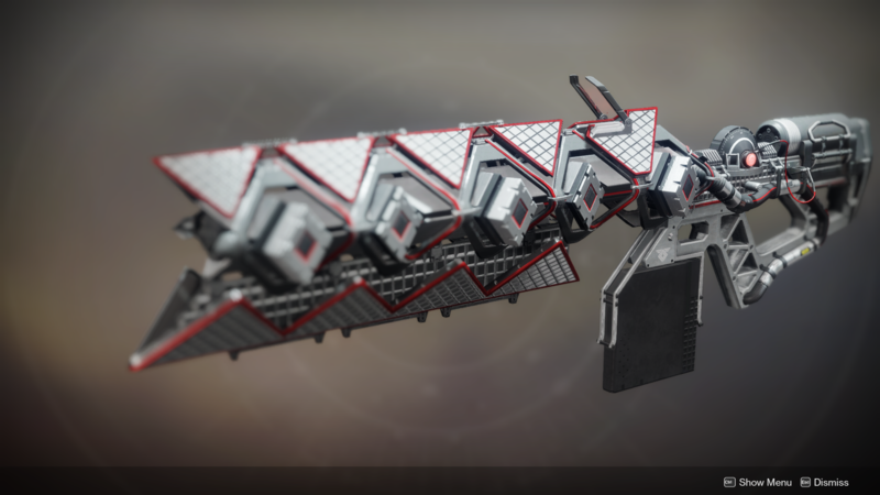 This image is a screenshot of a weapon from the Destiny series of first-person shooter video games developed by Bungie Studios and published by Bungie or Activision. It falls under the screenshot category for a copyrighted computer game or video game, and the copyright for it is most likely held by the company that developed the game. It is believed that the use of a limited number of web-resolution screenshots: