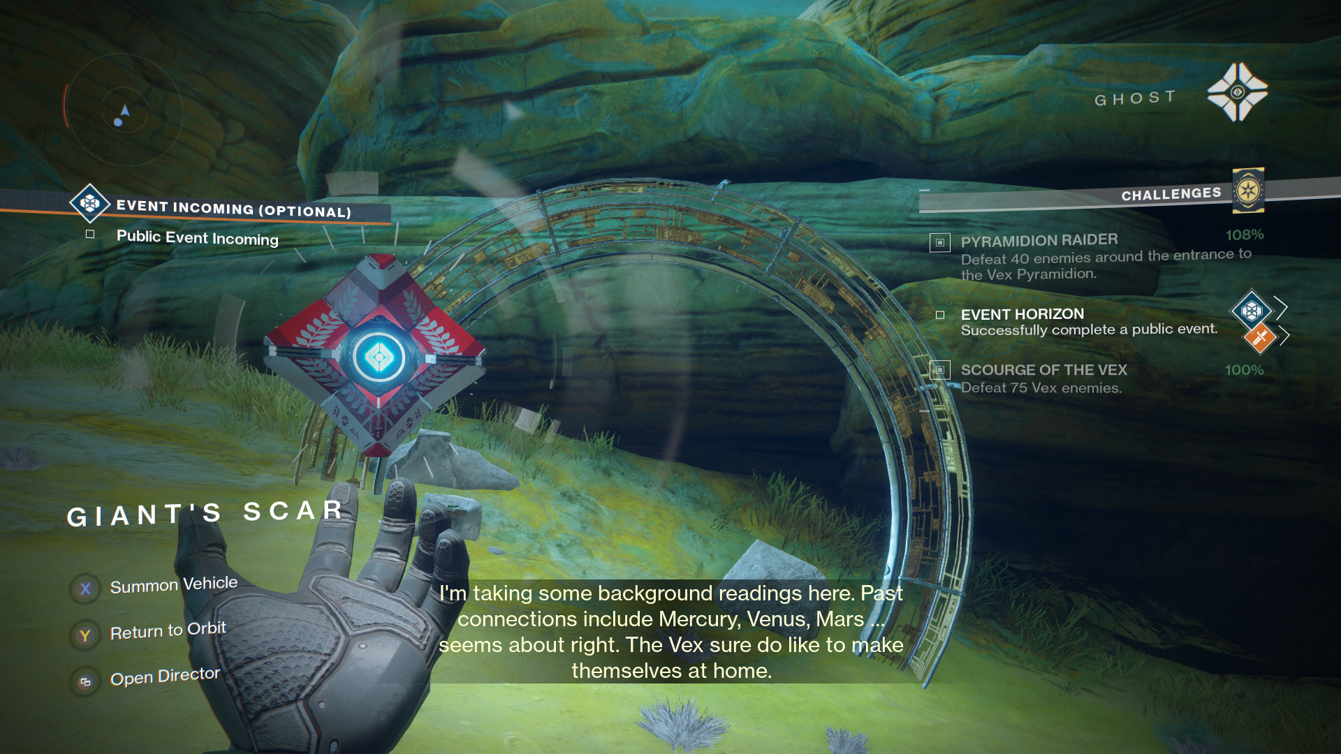 Ghost: "I'm taking some background readings here. Past connections include Mercury, Venus, Mars... seems about right. The Vex sure do like to make themselves at home."