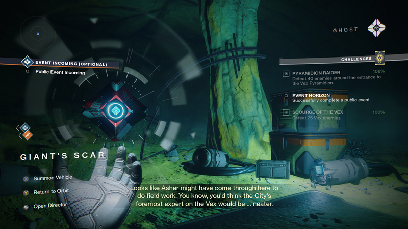 Ghost: "Looks like [Asher Mir|Asher]] might have come through here to do field work. You know, you'd think the City's foremost expert on the Vex would be... neater."