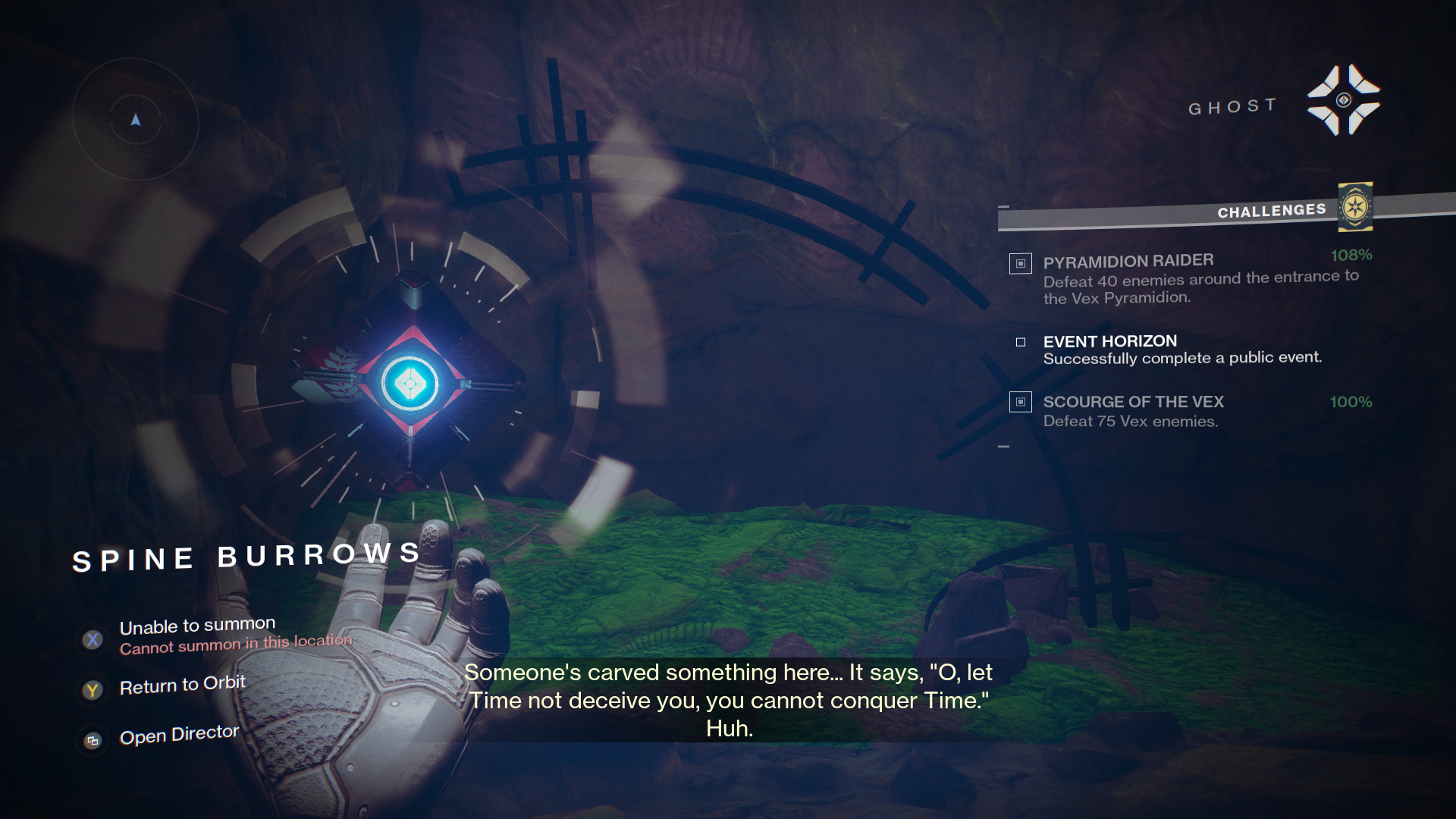 Ghost: "Someone carved something here... It says, 'O let Time not deceive you, you cannot conquer Time.' Huh."