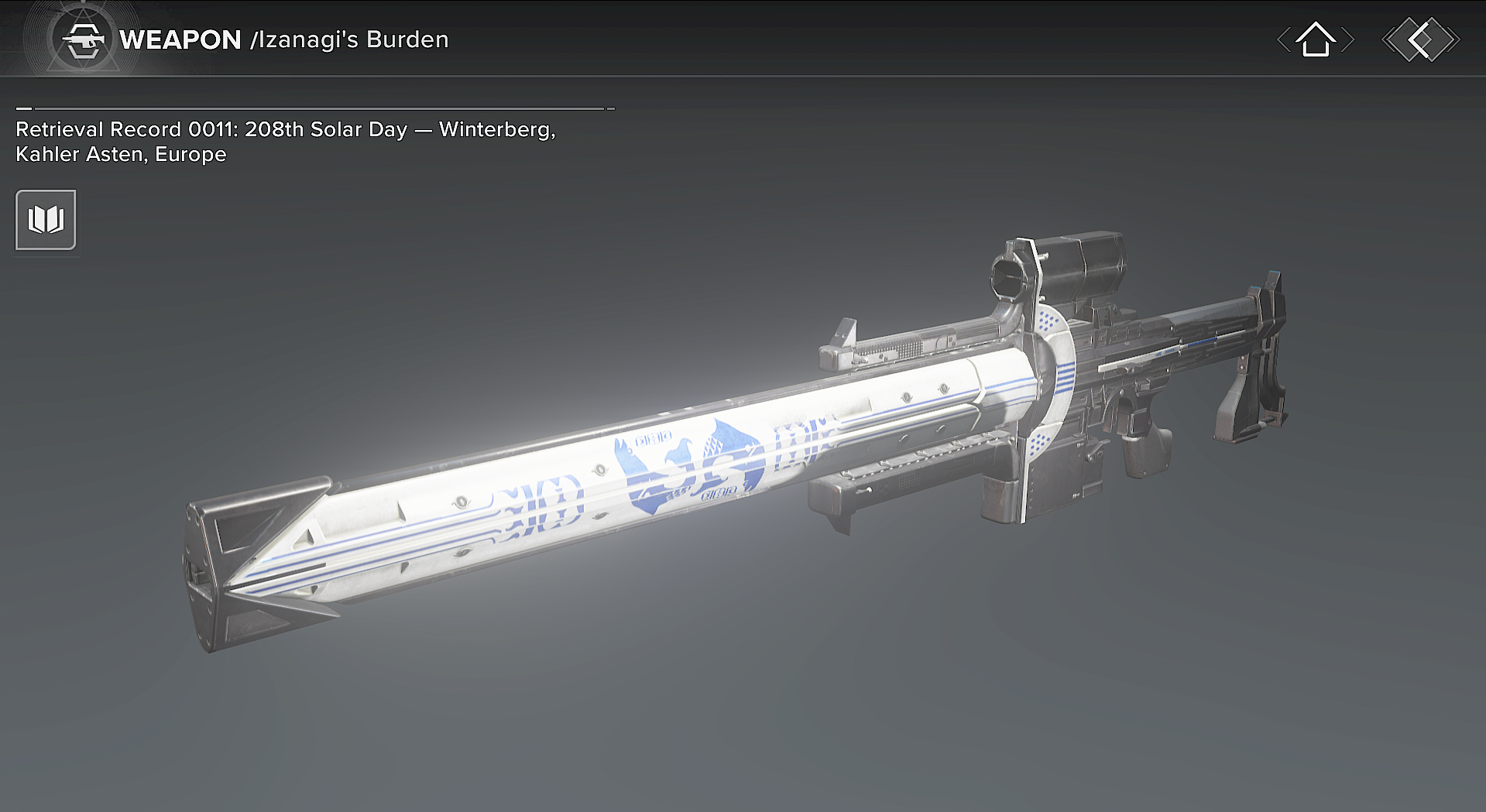 This image is a screenshot of a weapon from the Destiny series of first-person shooter video games developed by Bungie Studios and published by Bungie or Activision. It falls under the screenshot category for a copyrighted computer game or video game, and the copyright for it is most likely held by the company that developed the game. It is believed that the use of a limited number of web-resolution screenshots: