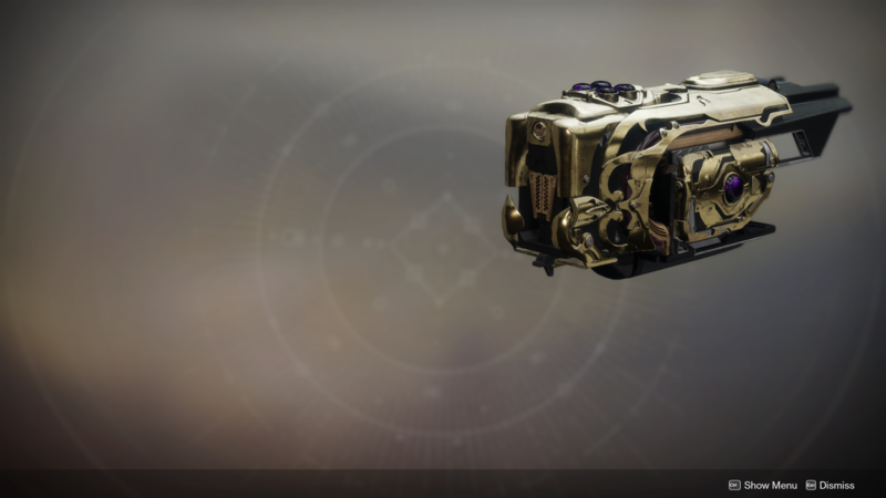 This image is a screenshot of a weapon from the Destiny series of first-person shooter video games developed by Bungie Studios and published by Bungie or Activision. It falls under the screenshot category for a copyrighted computer game or video game, and the copyright for it is most likely held by the company that developed the game. It is believed that the use of a limited number of web-resolution screenshots: