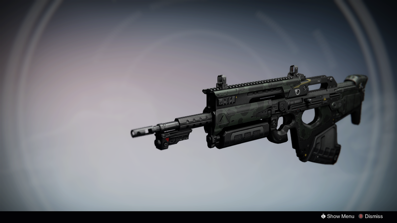 This image is a screenshot of a weapon from the Destiny series of first-person shooter video games developed by Bungie Studios and published by Bungie or Activision. It falls under the screenshot category for a copyrighted computer game or video game, and the copyright for it is most likely held by the company that developed the game. It is believed that the use of a limited number of web-resolution screenshots: