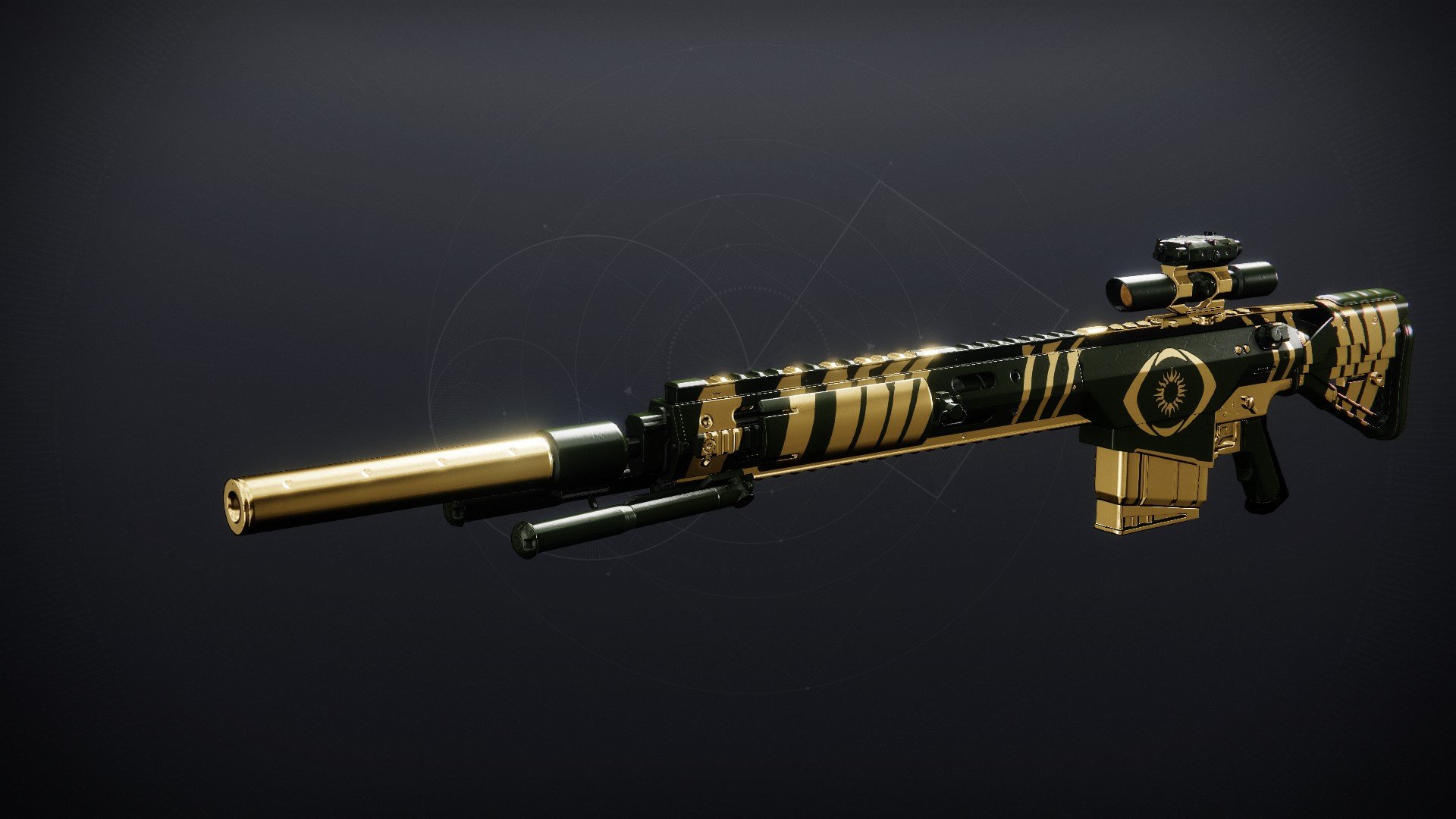 This image is a screenshot of a weapon from the Destiny series of first-person shooter video games developed by Bungie Studios and published by Bungie or Activision. It falls under the screenshot category for a copyrighted computer game or video game, and the copyright for it is most likely held by the company that developed the game. It is believed that the use of a limited number of web-resolution screenshots: