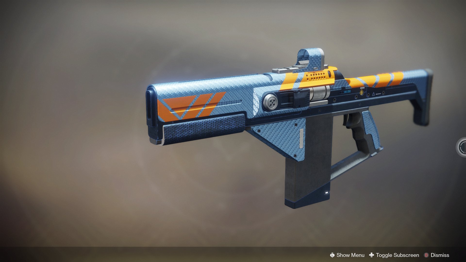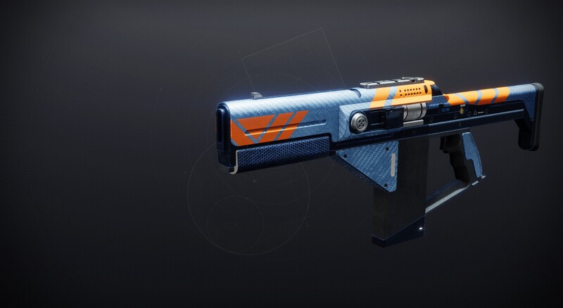 This image is a screenshot of a weapon from the Destiny series of first-person shooter video games developed by Bungie Studios and published by Bungie or Activision. It falls under the screenshot category for a copyrighted computer game or video game, and the copyright for it is most likely held by the company that developed the game. It is believed that the use of a limited number of web-resolution screenshots: