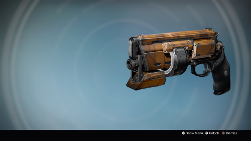 This image is a screenshot of a weapon from the Destiny series of first-person shooter video games developed by Bungie Studios and published by Bungie or Activision. It falls under the screenshot category for a copyrighted computer game or video game, and the copyright for it is most likely held by the company that developed the game. It is believed that the use of a limited number of web-resolution screenshots: