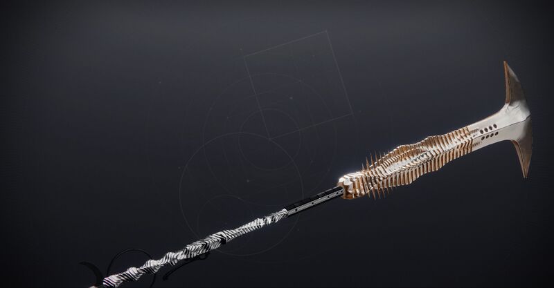 This image is a screenshot of a weapon from the Destiny series of first-person shooter video games developed by Bungie Studios and published by Bungie or Activision. It falls under the screenshot category for a copyrighted computer game or video game, and the copyright for it is most likely held by the company that developed the game. It is believed that the use of a limited number of web-resolution screenshots: