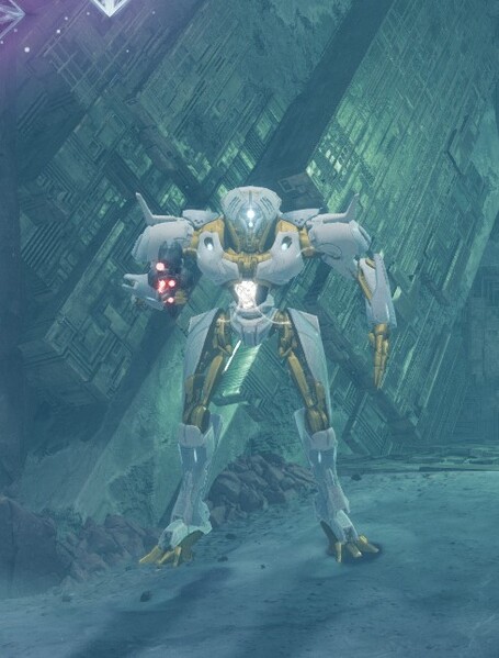 This image is a screenshot of a character or AI unit from the Destiny series of first-person shooter video games developed by Bungie Studios and published by Bungie or Activision. It falls under the screenshot category for a copyrighted computer game or video game, and the copyright for it is most likely held by the company that developed the game. It is believed that the use of a limited number of web-resolution screenshots: