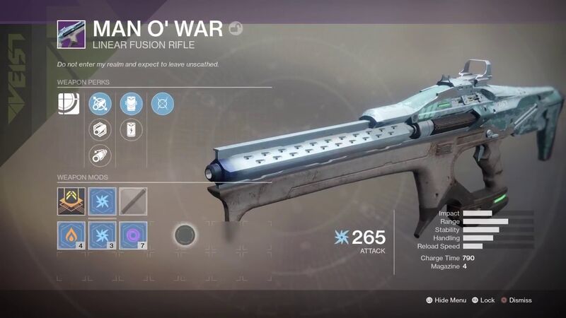 This image is a screenshot of a weapon from the Destiny series of first-person shooter video games developed by Bungie Studios and published by Bungie or Activision. It falls under the screenshot category for a copyrighted computer game or video game, and the copyright for it is most likely held by the company that developed the game. It is believed that the use of a limited number of web-resolution screenshots: