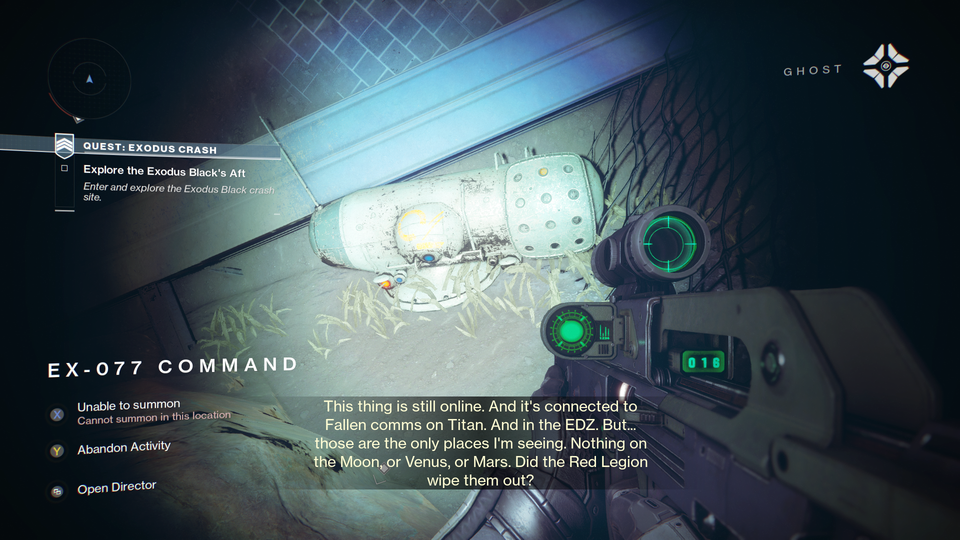Ghost: "This thing is still online. And it's connected to Fallen comms on Titan. And in the EDZ. But... those are the only places I'm seeing. Nothing on the Moon, or Venus, or Mars. Did the Red Legion wipe them out?"