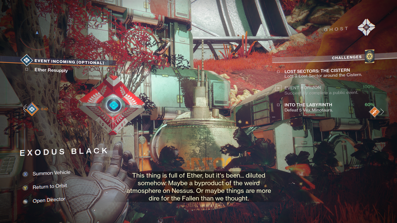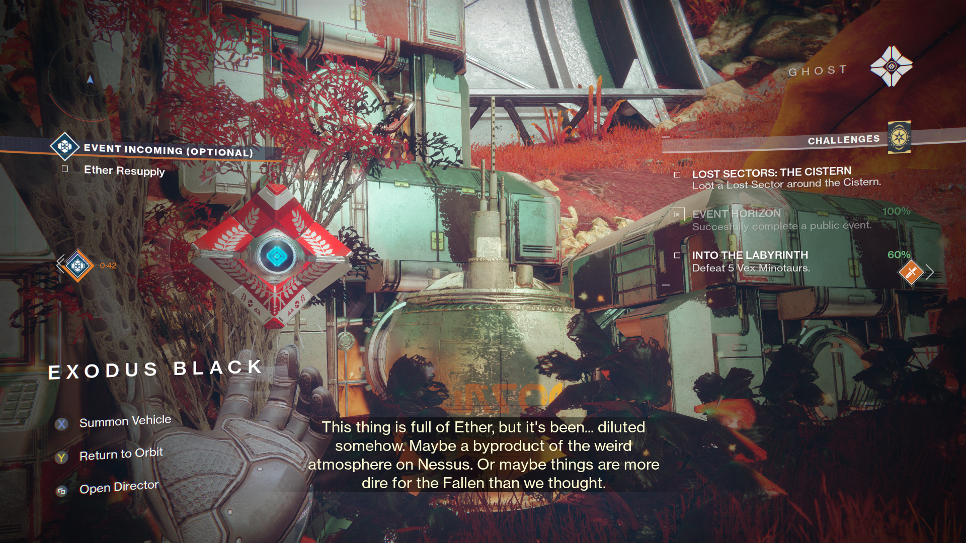 | current | 05:24, September 13, 2017 | 1,920 × 1,080 (3.59 MB) | KFC just (talk | contribs) | Ghost: "This thing is full of Ether, but, it's been... diluted somehow. Maybe a byproduct of the weird atmosphere on Nessus. Or maybe things are more dire for the Fallen than we thought." |