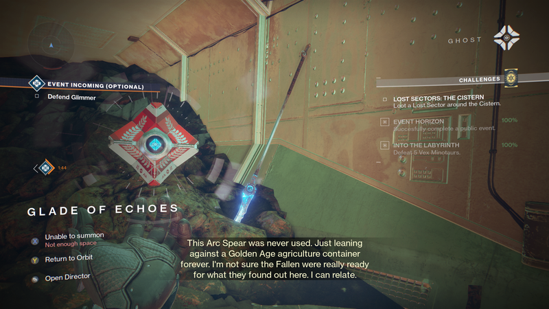 Ghost: "This Arc Spear was never used. Just leaning against a Golden Age agriculture container forever. I'm not sure the Fallen were really ready for what they found out here. I can relate."