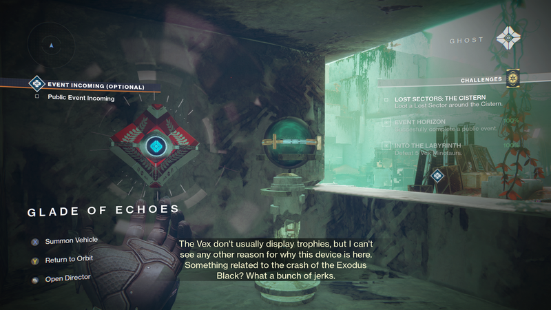 Ghost: "The Vex don't usually display trophies, but I can't see any other reason for why this device is here. Something related to the crash of the Exodus Black? What a bunch of jerks."