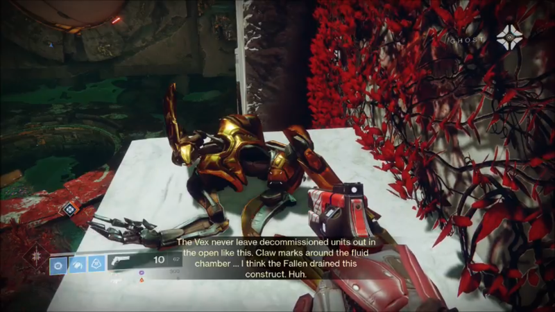 Ghost: The Vex never leave decommissioned units out in the open like this. Claw marks around the fluid chamber… I think the Fallen drained this construct. Huh.